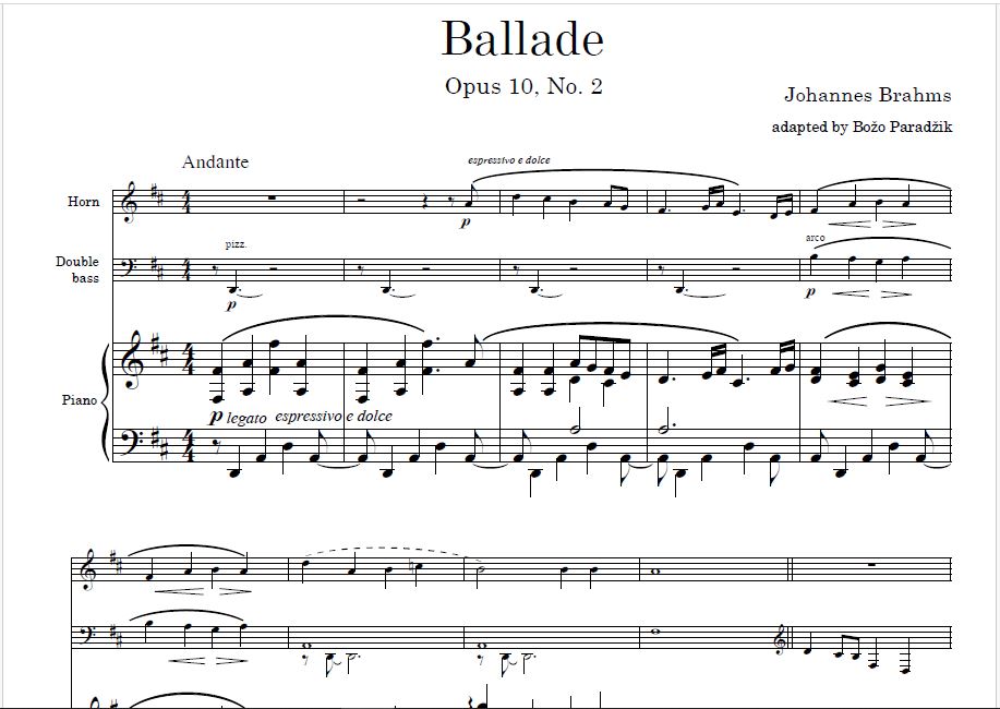 JOHANNES BRAHMS | Four Ballades, Opus 10 (originally for piano solo), published 1854 | instrumentation for horn, double bass and piano
