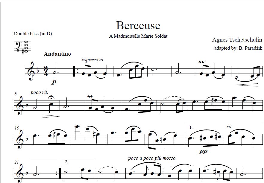 TSCHETSCHULIN | "Berceuse" (originally for violin and piano) | adapted for double bass and piano, PDF music for 4 different tuning variants