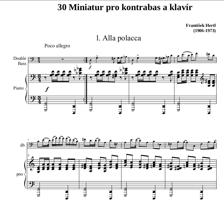 ABOUT 30 MINIATURES: As part of the cultural mandate of the Czechoslovak State Radio in the 1960s, as a valued member of the State Association of Czechoslovak Composers, František Hertl received several commissions for compositions. One of these compositions was the cycle of 30 miniatures for double bass and piano, in the grade of difficulty of the conservatory degree (equivalent to the bachelor's degree today). He was paid the fee in advance and was supposed to submit the scores by a deadline so that sheet music could be printed by the state music publishing house. Hertl delivered the sheet music in time for the expiry of the deadline, but for some inexplicable reason the sheet music never appeared. My ex professor Jiří Hudec has gotten once back in the 80's by František Hertl's widow a box full of Mr Hertl's manuscripts, including also some fully completed but yet unpublished compositions. "30 Miniatures for double bass and piano" were one of such compositions. With friendly, exclusive permission by František Hertl's daughter, Ms Květa Hertlová, this release can finally become real. These short pieces have never been released before, this is world's first release. Jiří Hudec has spent countless hours in the past few years to carefully enter the composers text into the scoring software. Some years later, composer Jiří Gemrot was kindly asked to check several strangely sounding chords and passages, so he did some minor corrections. This item includes the first "six-pack" with miniatures 1-6. My original wish was to publish all the miniatures at once, but the final revision of the sheet music and formatting have costed another impressive amount of hours, far more effort than expected. For that reason, this release will be better done stepwise, every time with six numerically following pieces. Besides an original version, we have decided also to transpose the parts of both instruments to make the music 100% compatible to any of the most popular options of tuning double bass. This luxory release features not only two versions of double bass part, but also two versions of the piano part: the original one, as well as a transposed in D (a major second higher). So all the combinations are now possible, upon performer's preference. Transposed scores contain sometimes just minor enharmonical changes, for easier reading.